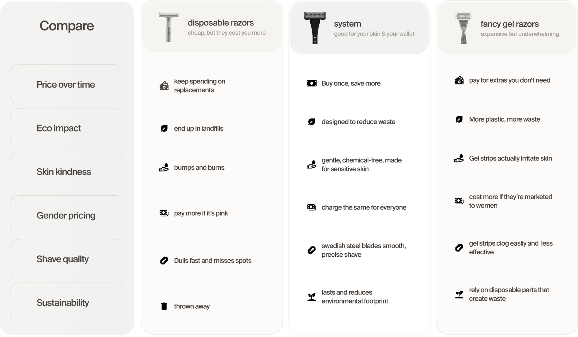 It means we charge the same fair price for everyone. No gender-based markups, no pastel packaging tricks. Just a great razor at the right price, for whoever picks it up.